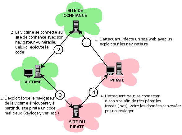 Certains sites malveillants contiennent du code malicieux pouvant être exécuté par un navigateur vulnérable. Nombre de ces attaques (buffer overflows, Java Runtime Environment, plugin Flash, etc.) existent et sont publiées régulièrement. Un exemple théorique est présenté sur le schéma ci-dessous :