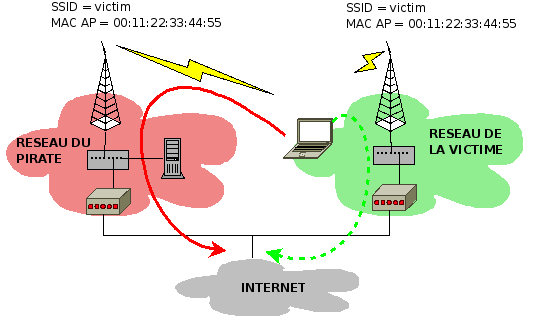 Dans une situation normale, la victime se connecte à Internet par l'intermédiaire de sa borne wifi, dont les SSID et adresse MAC valent respectivement victim et 00:11:22:33:44:55. Cependant, si un pirate récupère ces informations et qu'il créé un point d'accès aux mêmes caractéristiques, avec un signal plus fort, le portable de la vitime est susceptible de s'y connecter. Ainsi, le pirate pourra facilement sniffer le trafic et voler la session de la victime. |