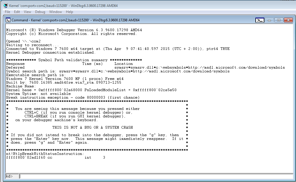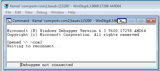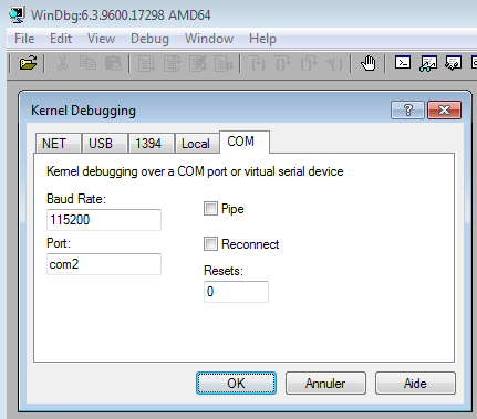 C:\>bcdedit /dbgsettings debugtype Serial debugport 2 baudrate 115200 The operation completed successfully. C:\>bcdedit Windows Boot Manager -------------------- identificateur {bootmgr} device partition=\Device\HarddiskVolume1 description Windows Boot Manager locale fr-FR inherit {globalsettings} default {default} resumeobject {f567f5a5-ddcd-11e4-8b74-ed09eab0b322} displayorder {default} {current} toolsdisplayorder {memdiag} timeout 30 Windows Boot Loader ------------------- identificateur {default} device partition=C: path \Windows\system32\winload.exe description Windows 7 locale fr-FR inherit {bootloadersettings} recoverysequence {f567f5a7-ddcd-11e4-8b74-ed09eab0b322} recoveryenabled Yes osdevice partition=C: systemroot \Windows resumeobject {f567f5a5-ddcd-11e4-8b74-ed09eab0b322} nx OptIn Windows Boot Loader ------------------- identificateur {current} device partition=C: path \Windows\system32\winload.exe description Windows 7 with debug locale fr-FR inherit {bootloadersettings} recoverysequence {f567f5a7-ddcd-11e4-8b74-ed09eab0b322} recoveryenabled Yes osdevice partition=C: systemroot \Windows resumeobject {f567f5a5-ddcd-11e4-8b74-ed09eab0b322} nx OptIn debug Yes - Shut the virtual machine down
