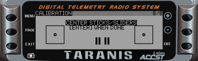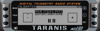 This screen will let you calibrate the sticks and pots on your radio. It is an important process that should be done at least for the first use, as well as if your drone drifts.