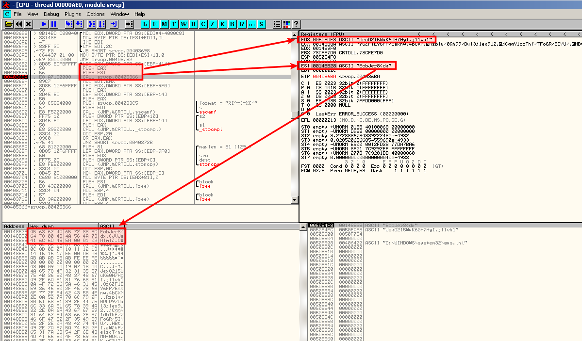 IDA-Pro also tells us that fscanf is called with the following parameter: %[^\n]\n. This is where the line of the configuration file is read. And loc_4036B2 is the address of the decoding function.