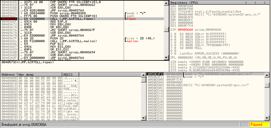 To decode it, let's use OllyDbg and set up a breakpoint where the file is called: