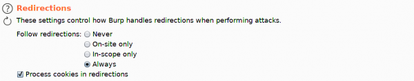 Next, click on the Options tab, and ensure that Follow Redirections is set to “Always”, and select the option to “Process cookies in redirections”.