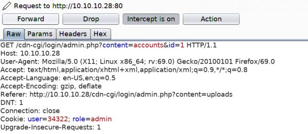 Let’s examine the portal further in Burp. We refresh on the Accounts page, which displays the user id for our current user, and intercept the request. We notice what seems to be a custom cookie implementation, comprising of the user value and role. We also notice the id parameter, which for our current admin user is 1.