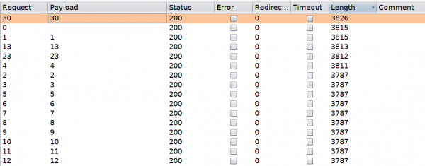 Click on the Target tab, and then click Start attack. We sort responses by Length, and view the results.