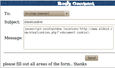 Click on "Private Message" from the menu and fill the form as follows, using following XSS: