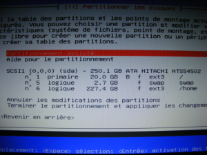 Suivre les étapes de l'installation. Pour le partitionnement d'un disque dur de 250Go, j'ai opté pour le partitionnement suivant pour une configuration poste de travail :