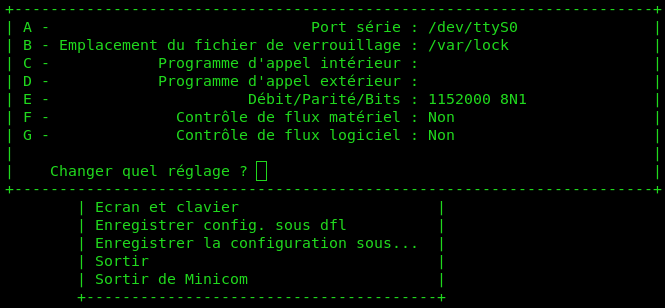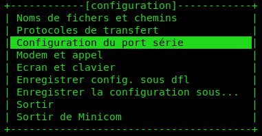 Une fois ces vérifications préliminaires effectuées, nous pouvons nous intéresser à la configuration de minicom. Lancer la commande suivante :