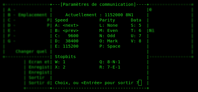 - Certaines options conduisent à d'autres menus. C'est le cas par exemple pour le menu "E - Débit/Parité/Bits", comme le montre la figure suivante :