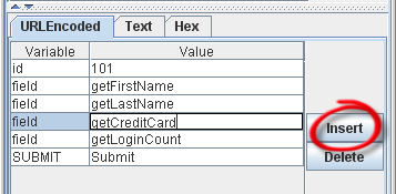 Pour ajouter le champ "Credit Card" dans les résultats, utiliser WebScarab afin d'intercepter la requête au moment de la soumission du formulaire, puis insérer un nouveau champ comme suit :