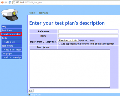 To create a new Test Plan, click on "Add a Test Plan" from the menu. Complete the form and click on "Go" to save it.