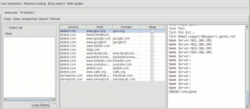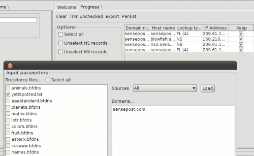 Based on a list of words grouped by themes (colors, animals, ...), this feature enables to bruteforce the discovery of valid hosts from a domain name. For each entry, it displays the type of record (NS, MX, A)