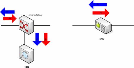 Alors que l'IDS est généralement considéré comme passif (sniffing, analyse du traffic dans le but d'une reconnaissance d'un comportement douteux sur base de signatures connues), l'IPS est plus réactif, dans la mesure où il est en coupure directe, comme le montre le schéma suivant :