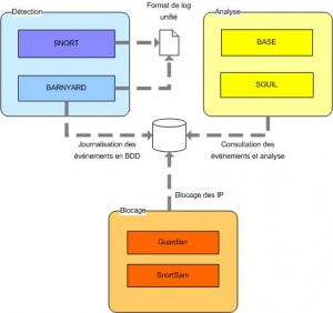 Guardian assurera le blocage des adresses IP détectées comme suspectes. Par ailleurs, BASE et/ou SGUIL permettront d’analyser ces attaques.