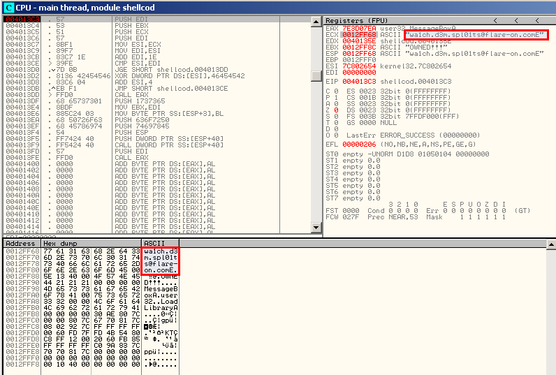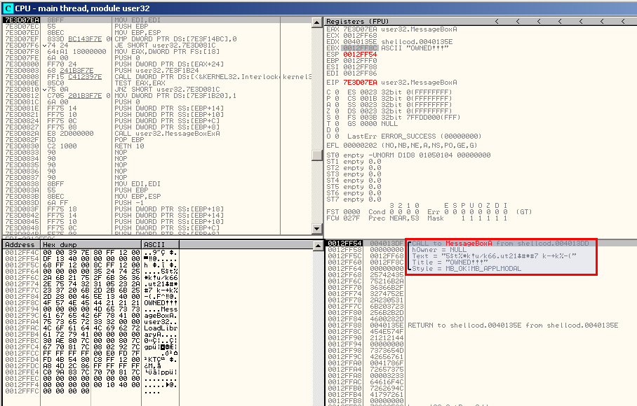Let's open shellcode.exe into OllyDbg and put a breakpoint at 0x4013DD. When we run the program, it stops at this address and just a step in (F7) after, we see the call to the MessageBox: