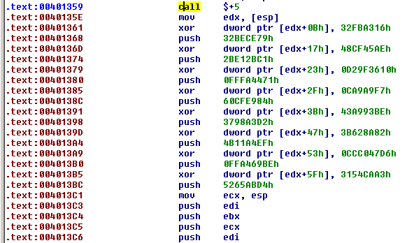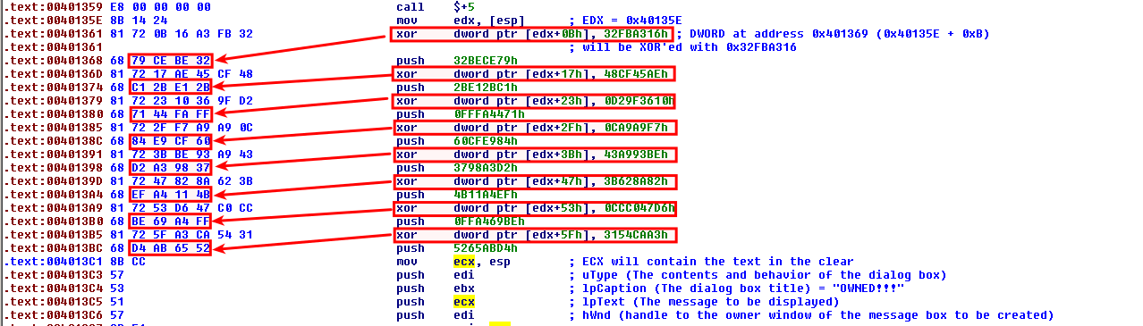 .text:00401361 81 72 0B 16 A3 FB 32 xor dword ptr [edx+0Bh], 32FBA316h ; DWORD at address 0x401369 (0x40135E + 0xB)
