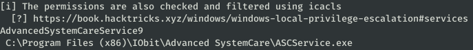 AbuseFunction : Write-ServiceBinary -ServiceName 'AdvancedSystemCareService9' -Path <HijackPath>
