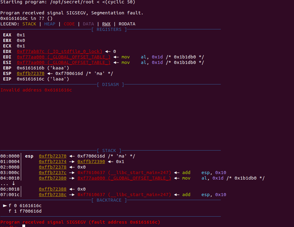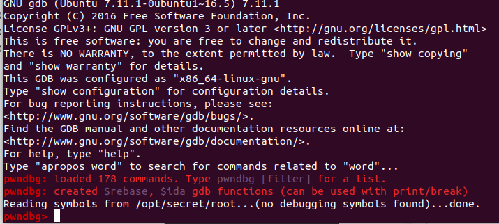 Run gdb /opt/secret/root and you should see a screen similar to this