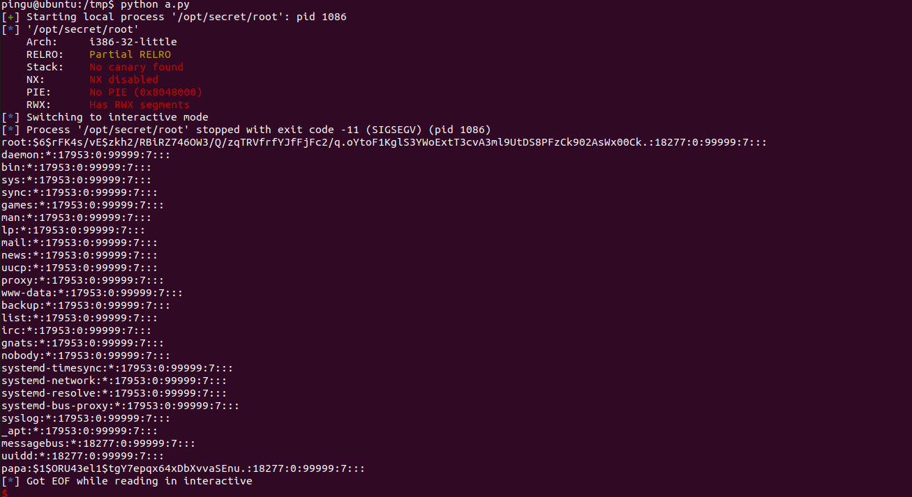 $ file /opt/secret/root /opt/secret/root: setuid ELF 32-bit LSB executable, Intel 80386, version 1 (SYSV), dynamically linked, interpreter /lib/ld-linux.so.2, for GNU/Linux 2.6.32, BuildID[sha1]=af41c72a4c8f1a4d720315cdafa47536e92657b2, not stripped