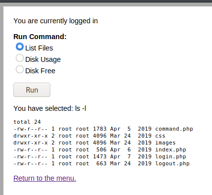 Once authenticated with admin:happy, we see a page with a link to “System Tools > Command”. Click on the link to be redirected to a form with 3 commands: