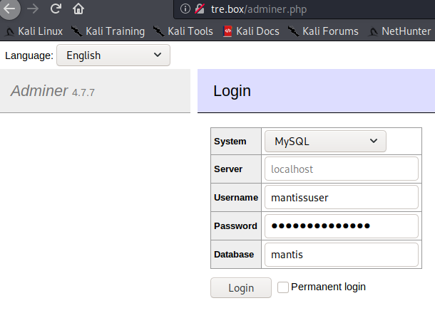 kali@kali:/data/Tre_1/files$ curl -s http://tre.box/mantisbt/config/ | html2text