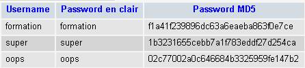 Une bonne pratique est de ne jamais stocker les mots de passe "en clair" dans la base de données. Il est indispensable de les encrypter en MD5 :